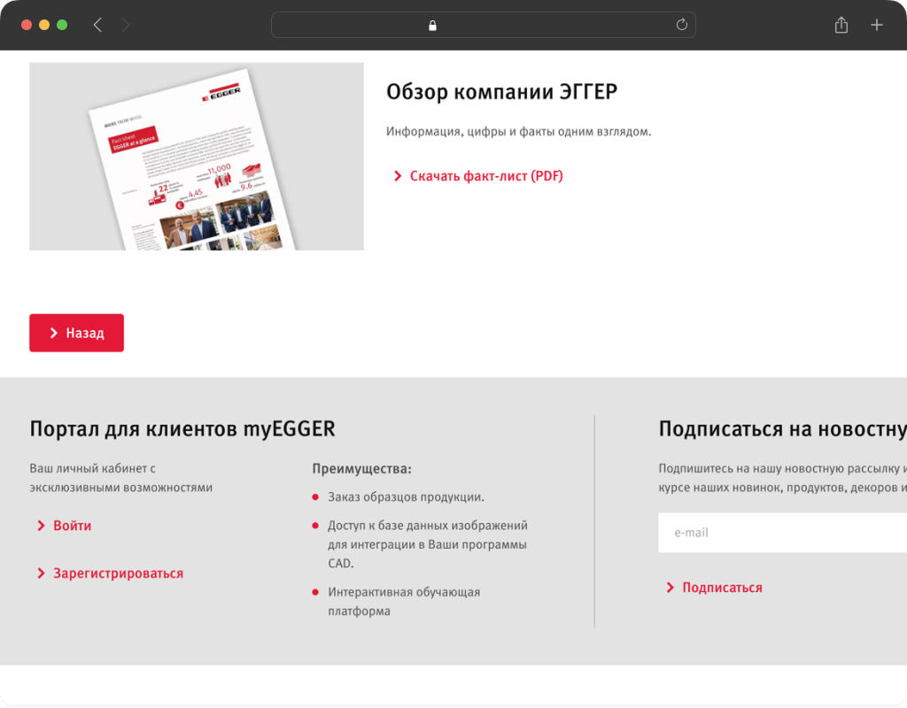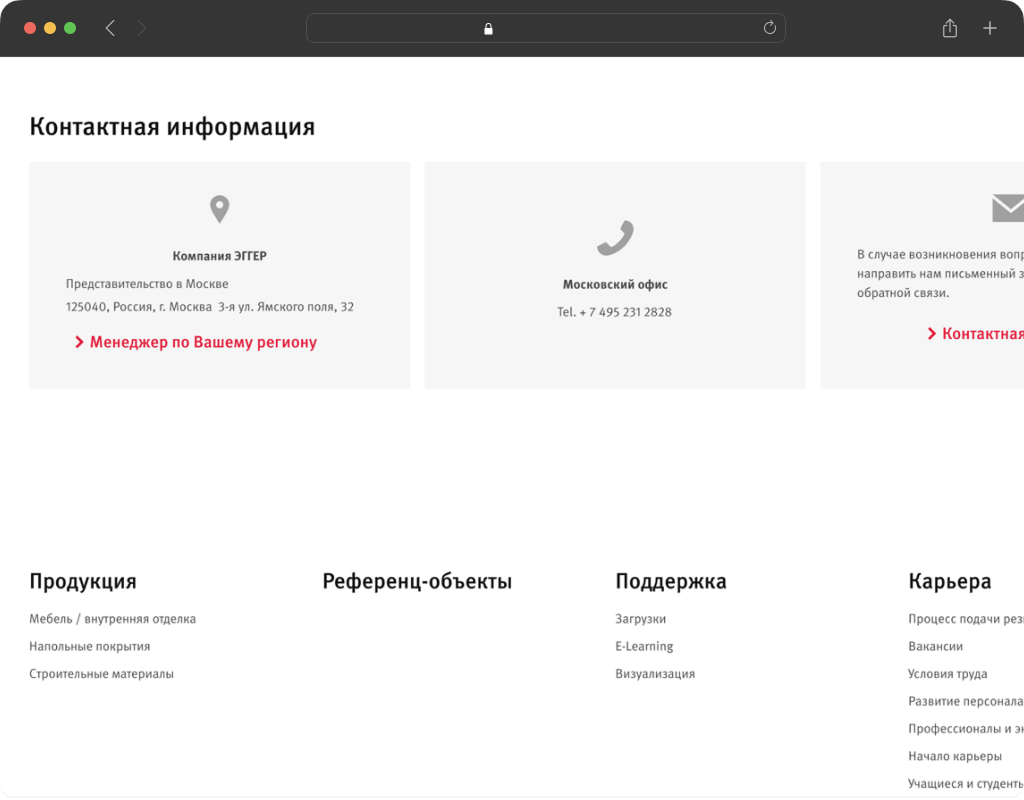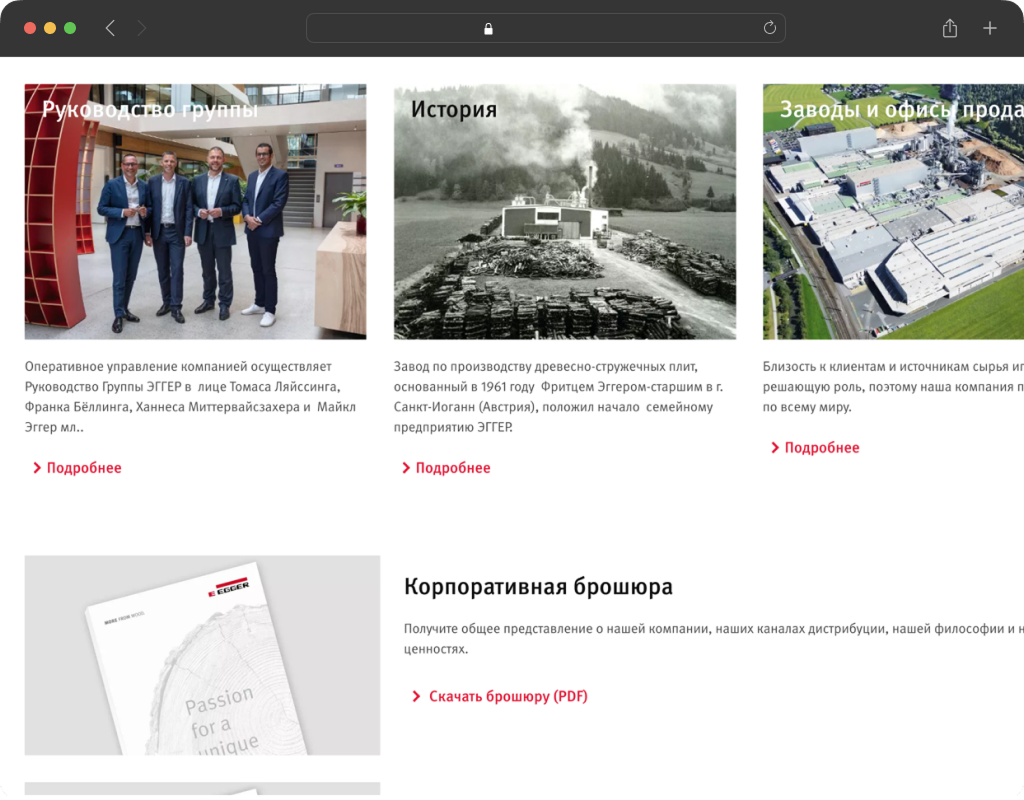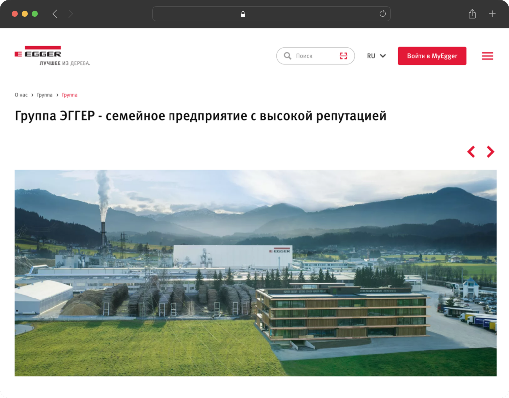 Дизайн сайта соответствует международным стандартам компании ЭГГЕР, но адаптирован под российскую аудиторию.